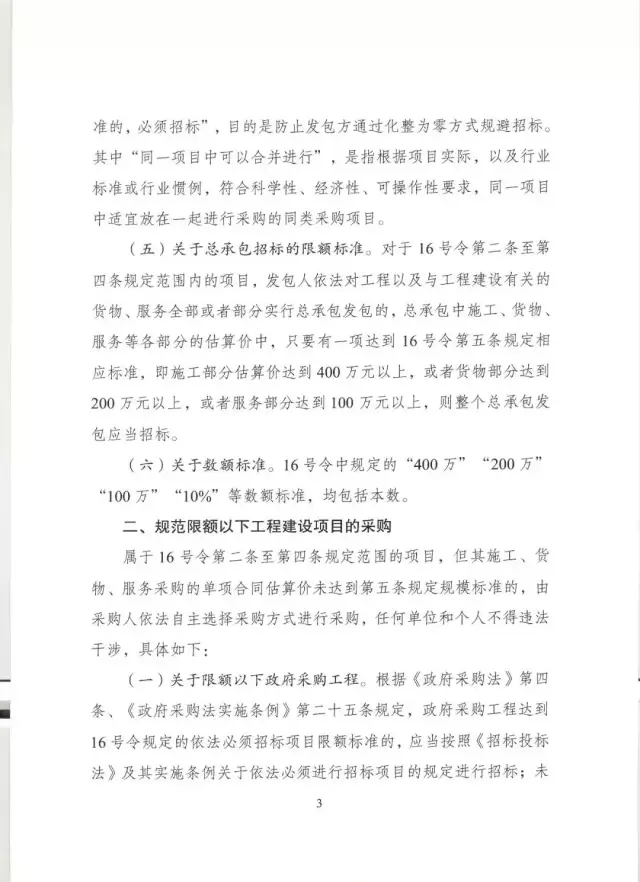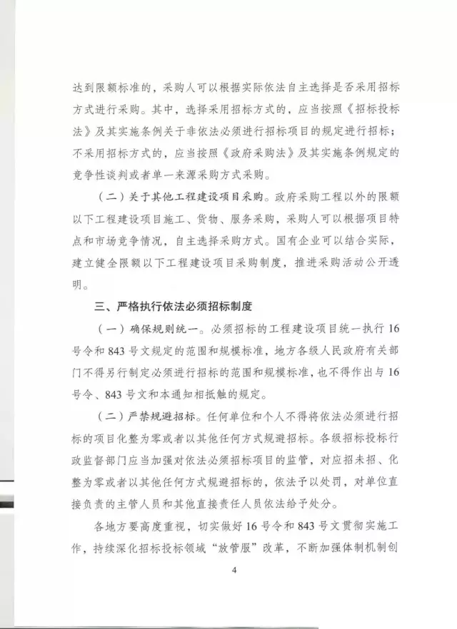 此外,《通知》再次強(qiáng)調(diào),應(yīng)確保規(guī)則統(tǒng)一,地方人民政府不得另行制定依法必須招標(biāo)的范圍和限額標(biāo)準(zhǔn),也不得作出與16號(hào)令、843號(hào)文和《通知》相抵觸的規(guī)定。