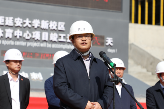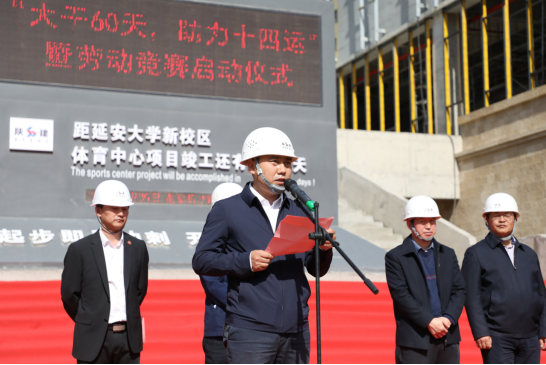 延安大學(xué)黨委委員、副校長楊偉宏致辭,他代表延安大學(xué)全體師生向疫情期間奮戰(zhàn)在一線的施工人員及陜建集團表示衷心感謝,對十三建公司承建的延大體育中心項目建設(shè)給予充分肯定。他指出,延安大學(xué)體育中心項目作為十四運重點建設(shè)項目,意義重大。當前,項目建設(shè)進入60天倒計時,希望全體參建人員從延安精神中汲取力量,大力弘揚愛崗敬業(yè)、艱苦奮斗的勞模精神,進一步統(tǒng)一思想,提高認識,鼓足干勁,用一流的速度,一流的品質(zhì),展現(xiàn)陜建集團的國企風(fēng)采和責(zé)任擔當,為第十四屆全運會順利召開貢獻力量。