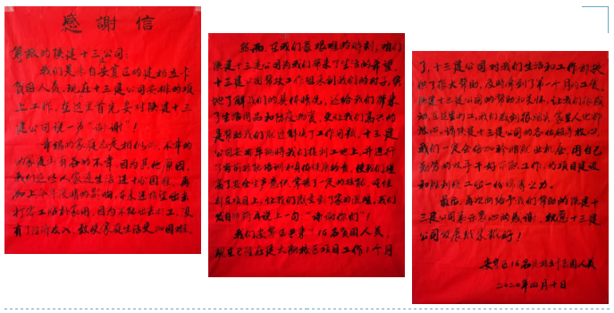 十三建公司結(jié)合每一名貧困戶的實際情況,按照就近安排的原則,把他們都安排在離家比較近的項目,既方便上班,又能照顧家里。為了讓貧困人員更好地適應(yīng)崗位需求,項目部對他們進行了崗前培訓(xùn)和安全教育,普及文明施工知識,開展相關(guān)技能培訓(xùn)。如今過去一個月了,所有貧困就業(yè)人員都及時拿到了第一個月工資,為了表達(dá)他們的心意,聯(lián)名給十三建公司寫了一封“感謝信”。