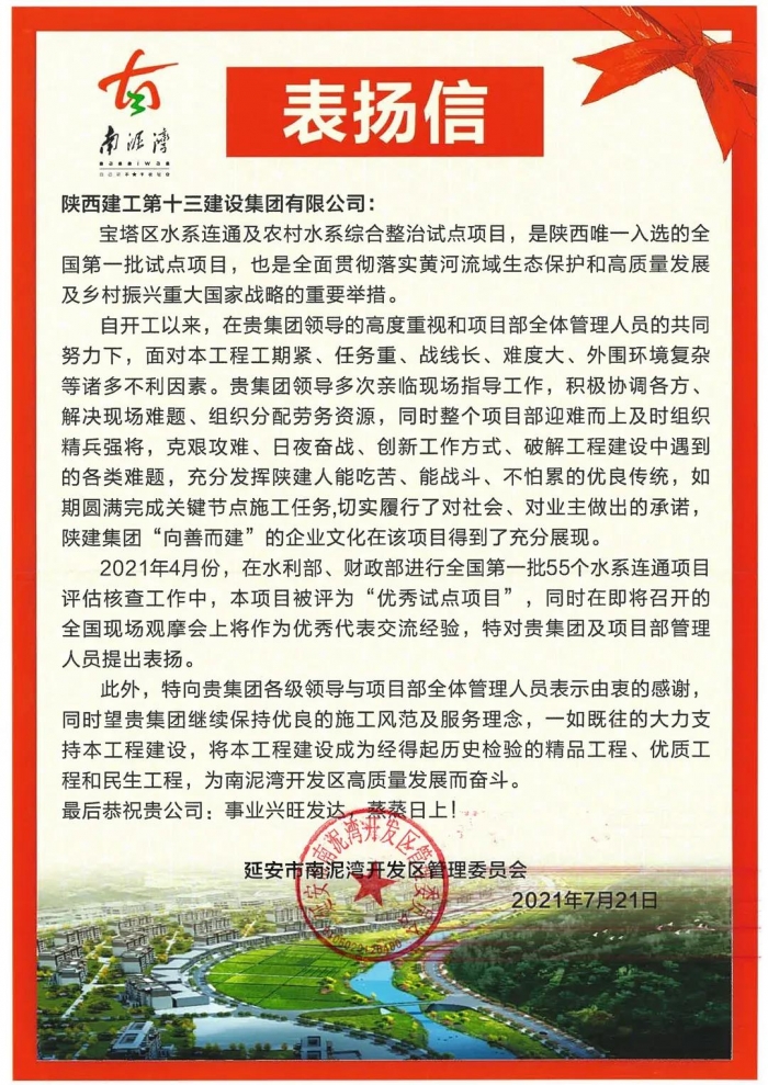 近日,陜建十三建集團(tuán)收到了來(lái)自南泥灣開(kāi)發(fā)區(qū)管委會(huì)的表?yè)P(yáng)信。信中,對(duì)集團(tuán)寶塔區(qū)水系連通及農(nóng)村水系綜合整治試點(diǎn)項(xiàng)目全體管理人員表示了高度贊揚(yáng)。